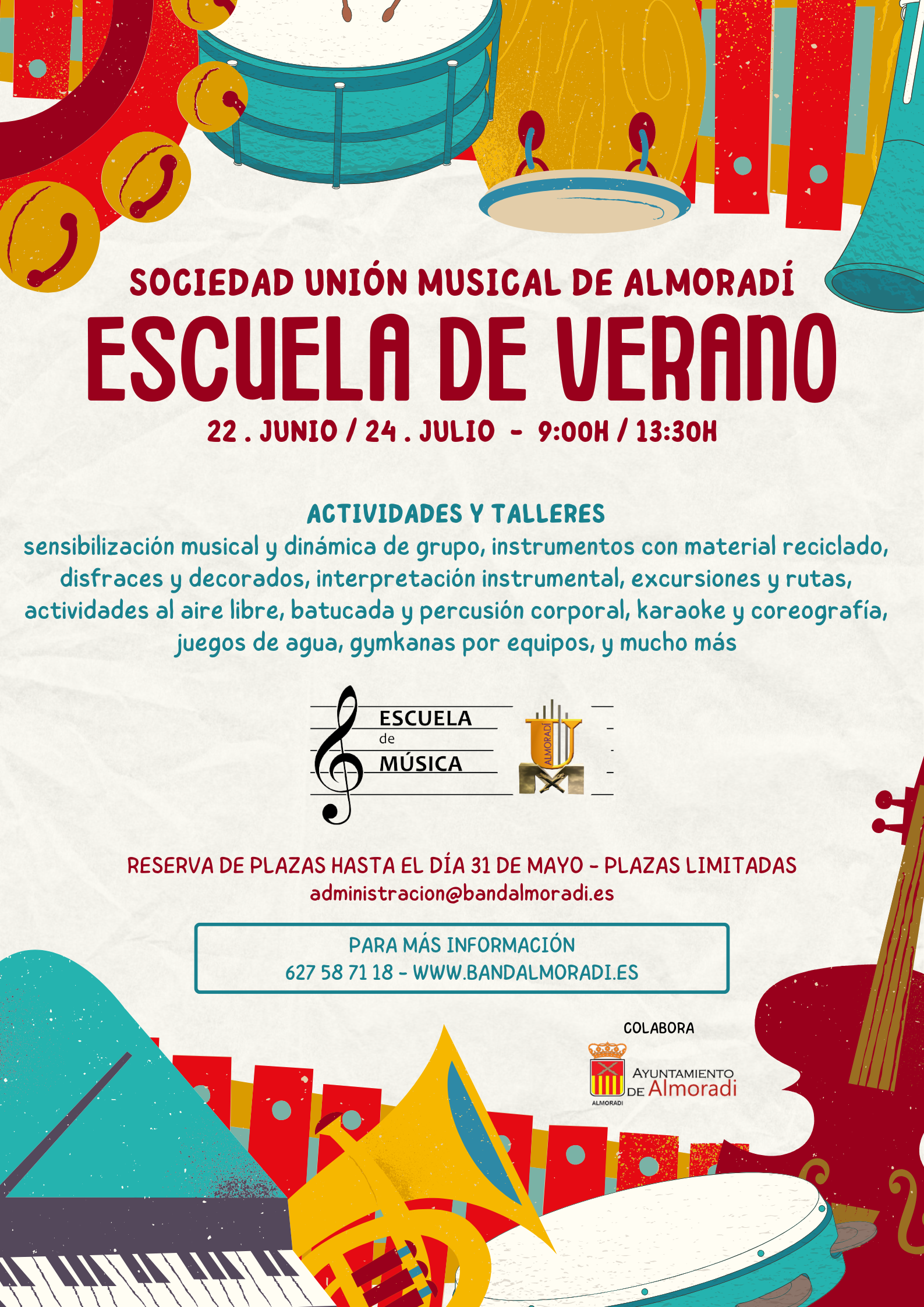 El plazo para la reserva de plazas queda abierto hasta el próximo DOMINGO 31 DE MAYO – siendo la manera de realizarlo, rellenar el PDF adjunto con los datos del alumno, y enviarlo al correo electrónico administracion@bandalmoradi.es